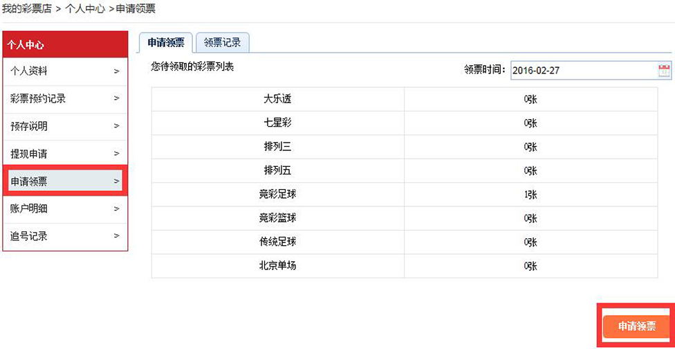 4、您每次申请领票时,需要将当时可申领的彩票全部申领。